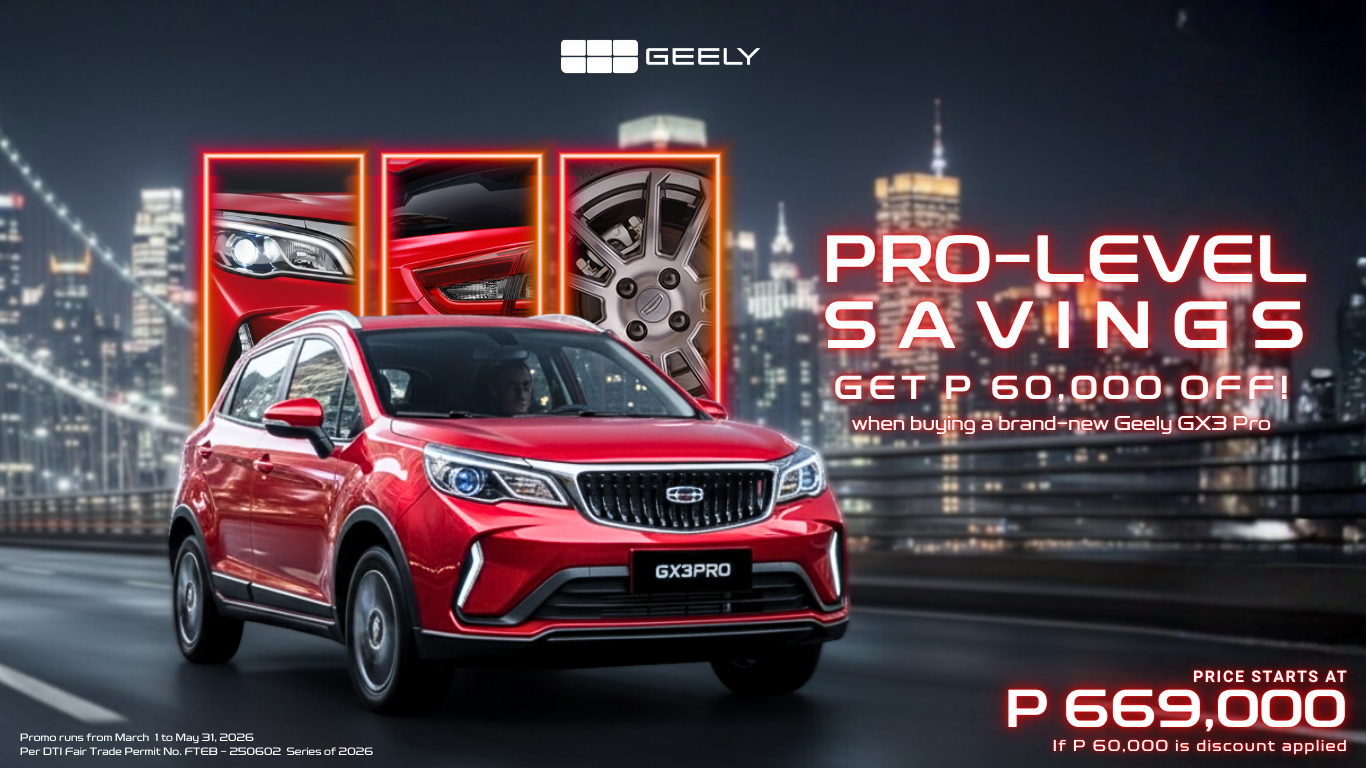 - The “Pro-Level Savings” Sales Promo is open to all existing and new customers who will purchase a new any variant of the Geely GX3 Pro from any authorized Geely dealerships nationwide.