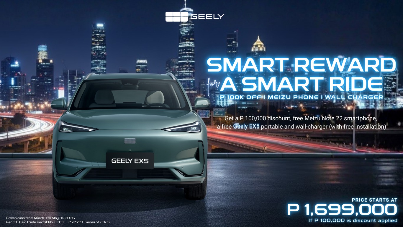 - The “Smart Reward for a Smart Ride” Sales Promo is open to all existing and new customers who will purchase a new Geely EX5 Max from any authorized Geely dealerships nationwide.