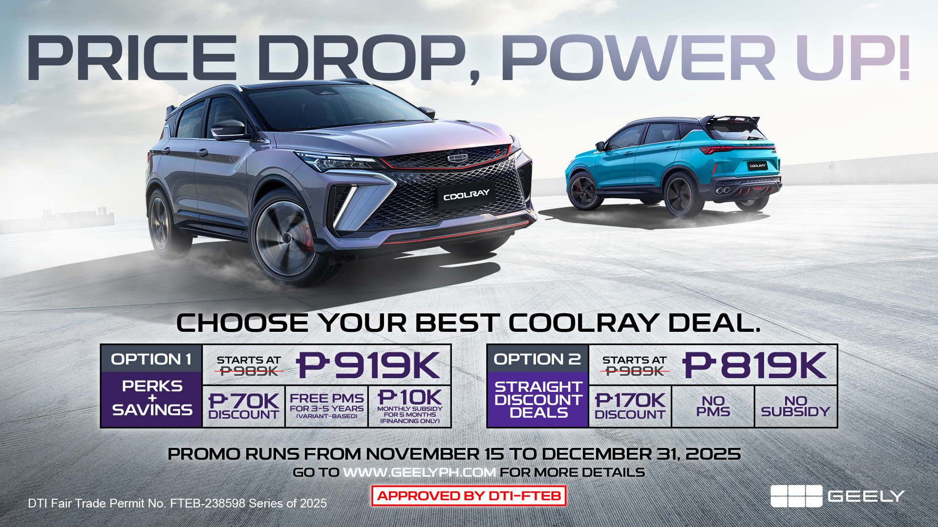 - The “Price Drop, Power Up Promo” Sales Promo is open to all existing and new customers who will purchase any variant of the new Geely Coolray from any authorized Geely dealerships nationwide.